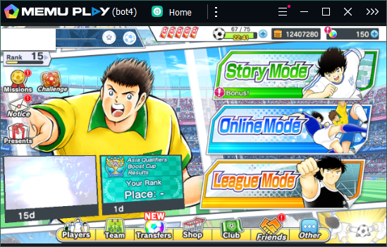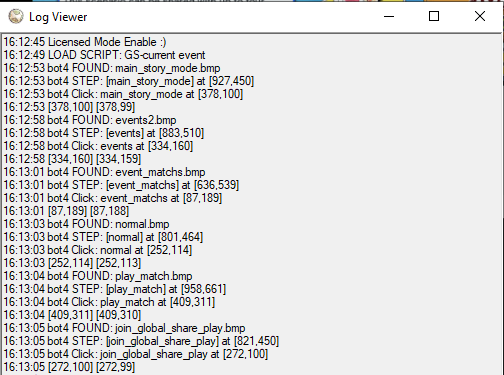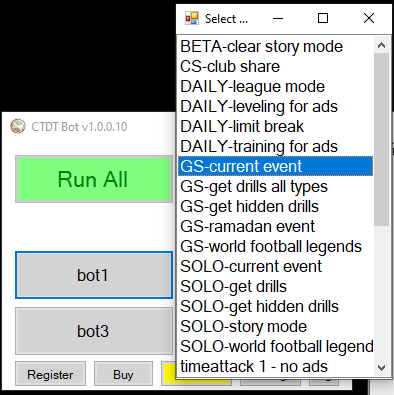 1. Start you BlueStacks/MEmu first 2. Enter your CaptainTsubasa App in BlueStacks/MEmu 3. Open Bot and click bot1 button 4. Select GS-current event 5. Bot will running now 6. if bot working BlueStacks/MEmu windows should resize and move to upper left of you screen and Log Viewer Window should display some action